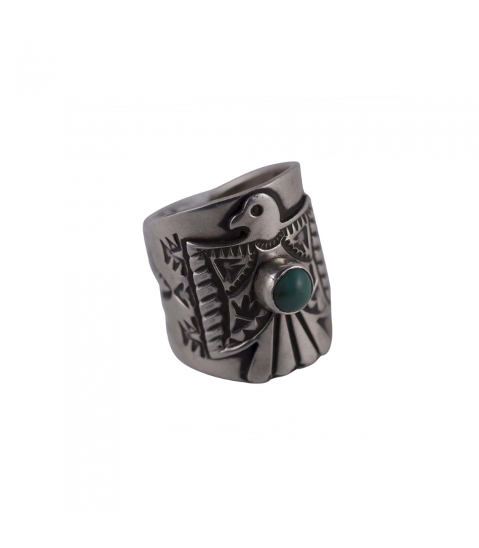 Grosse chevalière Navajo "Thunderbird" en Argent et "Kingman" Turquoise, pièce unique par Daryl Cadman, pour homme ou femme