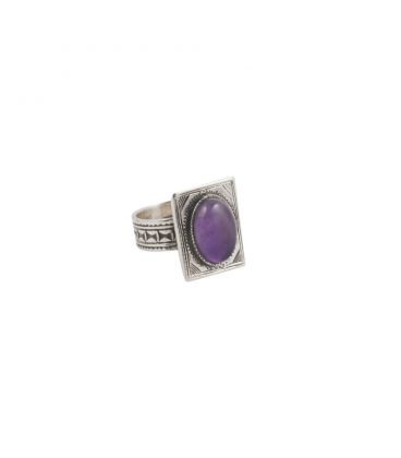 BAGUE TOUAREG CARRÉE EN ARGENT GRAVE ET AMETHYSTE, COLLECTION AFRIQUE, POUR FEMME