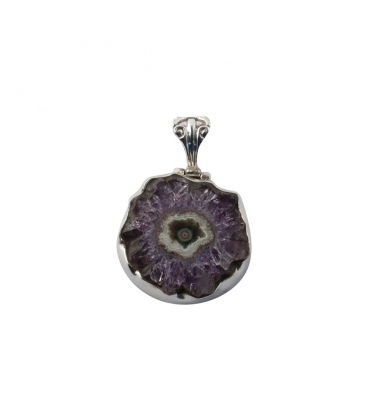 Magnifique pendentif Indien rond en Argent 925/1000°brodé et tranche d'Amethyste.